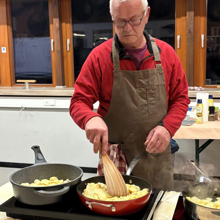 Wie in den letzten Jahren üblich, kümmerte sich Christian Iwen um die Zubereitung des Knipps und der 1. Vorsitzende und Sportleiter Harald Kohlmann war für die Bratkartoffeln zuständig, selbstverständlich nach Wünschen der Mitglieder mit und ohne Zwiebeln. Zum Buffett gehörten natürlich auch Brot, Gurken und Apfelmus.